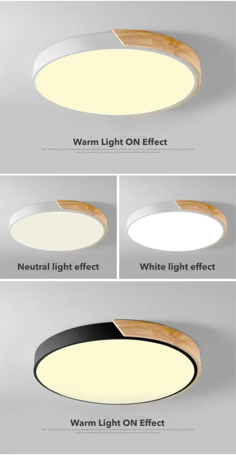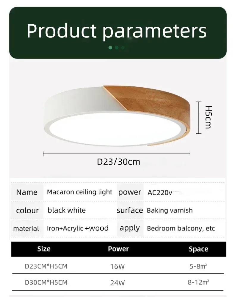 Specifications Size Diameter: 23cm,30cm, Height 5cm voltage:AC220v Power: 23cm-16W,30cm-24W 【White light】: No Dimmable. , Only White light,color temperature 6500-6000K. 【Warm light】: No Dimmable. Only Warm white, color temperature 3000-3200K. 【3 color light】: contain White light,Warm light,Neutral light. Attention: 【3-color light type】You can simply turn on/off the wall switch to change the color of the light, changing it from warm light to neutrallight, and then back to white light.