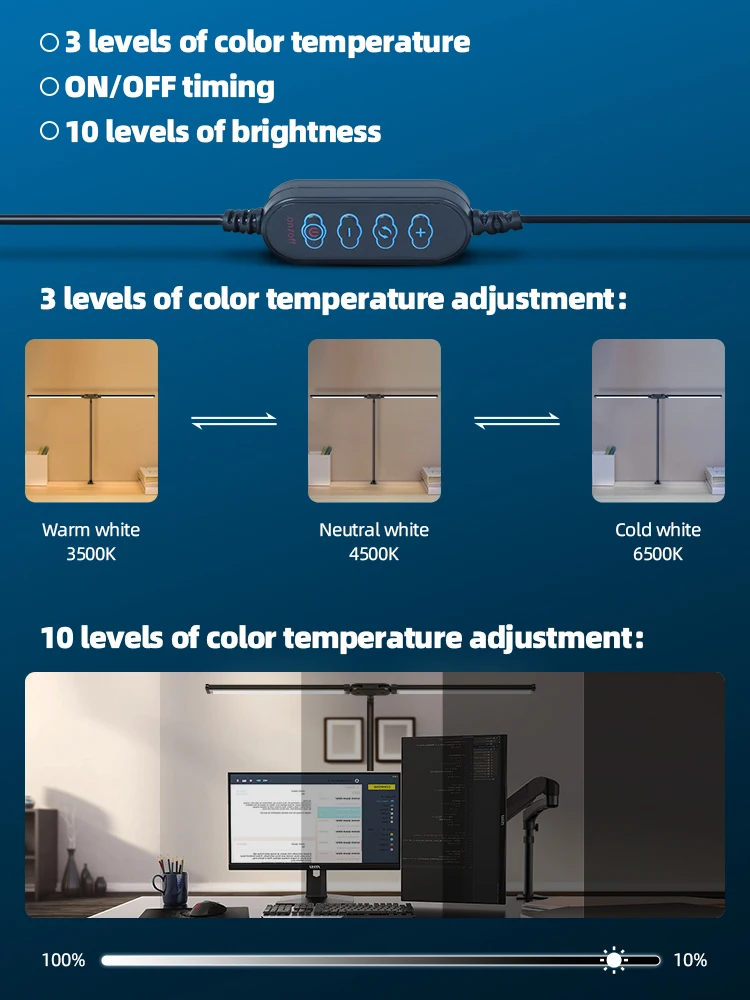 --【Press button Control】 With sensitive press buttons, the black table light can easy to control color temperature and brightness individually. It includes 10 dimming levels and adjustable 3 color temperatures modes (3,000 K-6,500 K). And the memory function remembers your last Settings. No flickering, no ghostly freezing, no screen glare