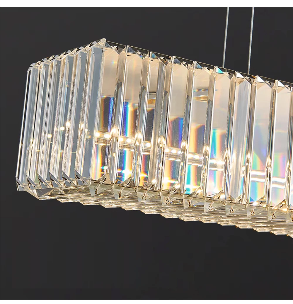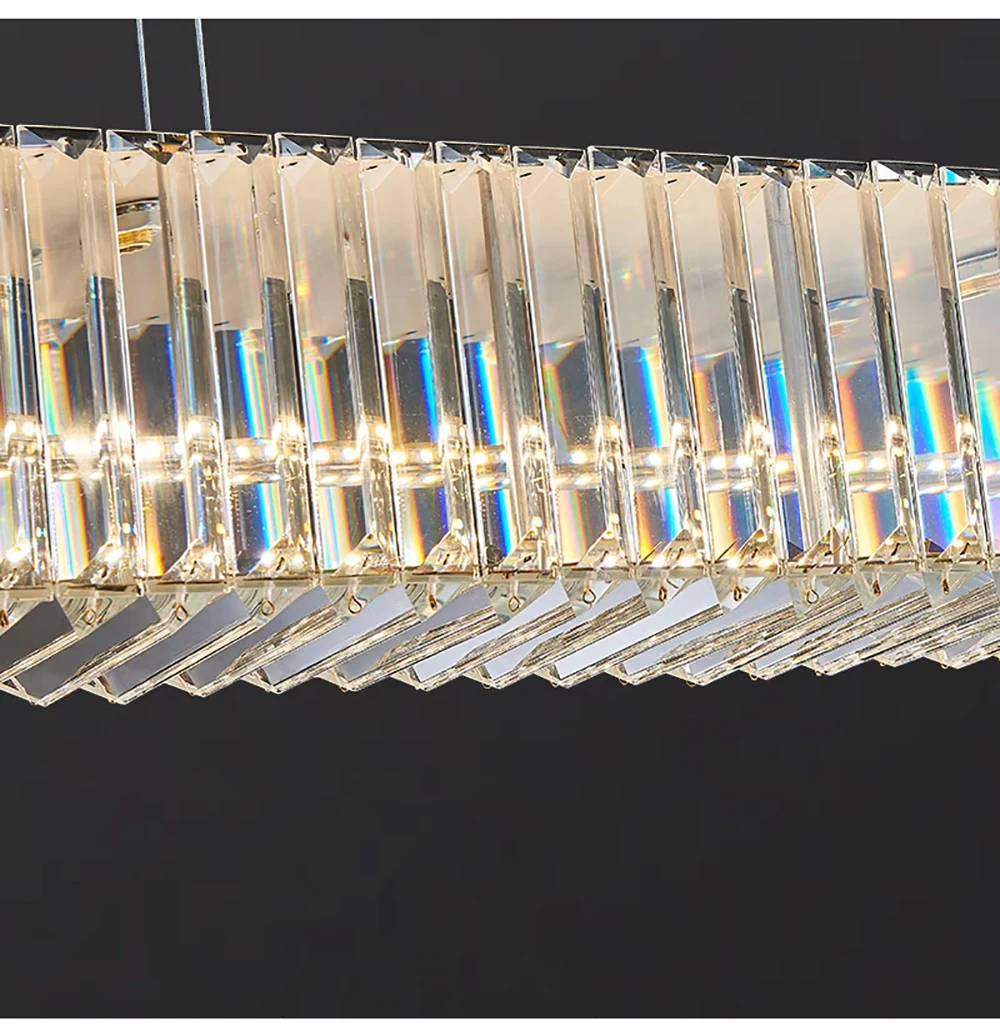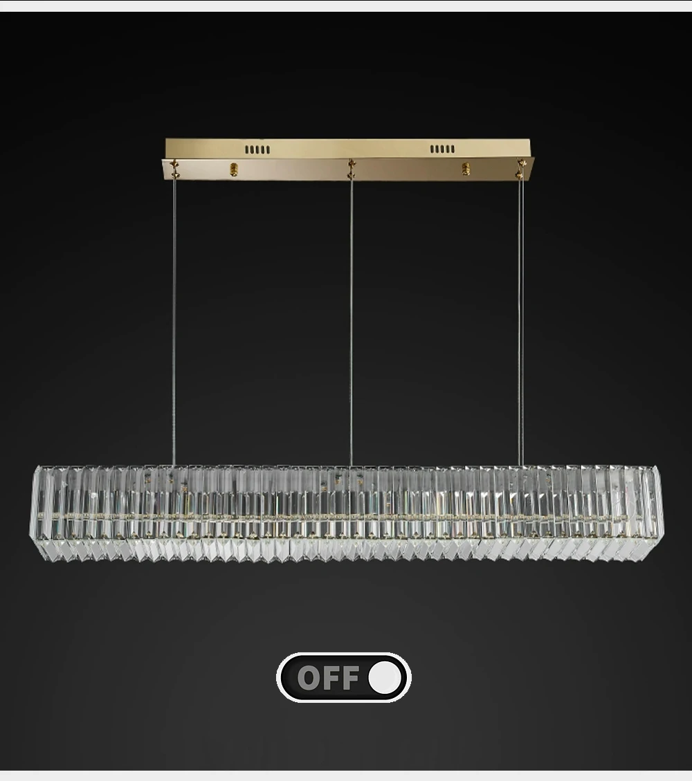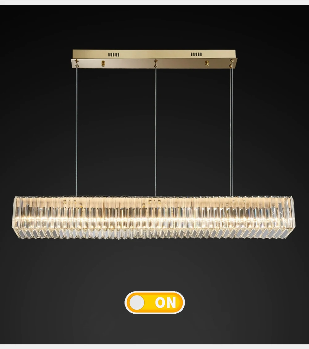Elevate your dining room decor with the Long Chandeliers for Dining Room, a luxurious addition to your home's lighting ensemble. This modern hanging lamp features a sleek design adorned with golden accents and sparkling crystals, exuding elegance and sophistication. Crafted from high-quality stainless steel with a polished steel finish, this chandelier is designed to enhance the ambiance of any dining space.