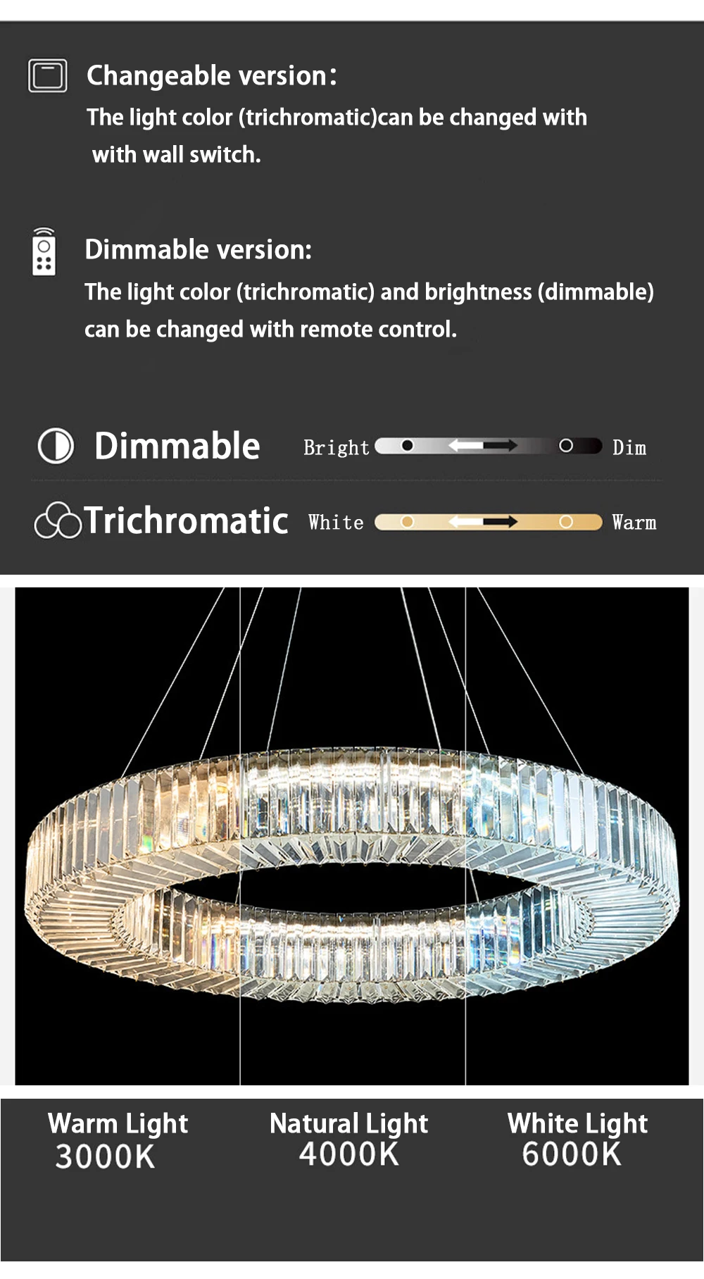2. Changeable Version:The Light Color can be changed with wall switch, each time turn off and on (in short period), the light color will changed (warm light / white light / natural light).
