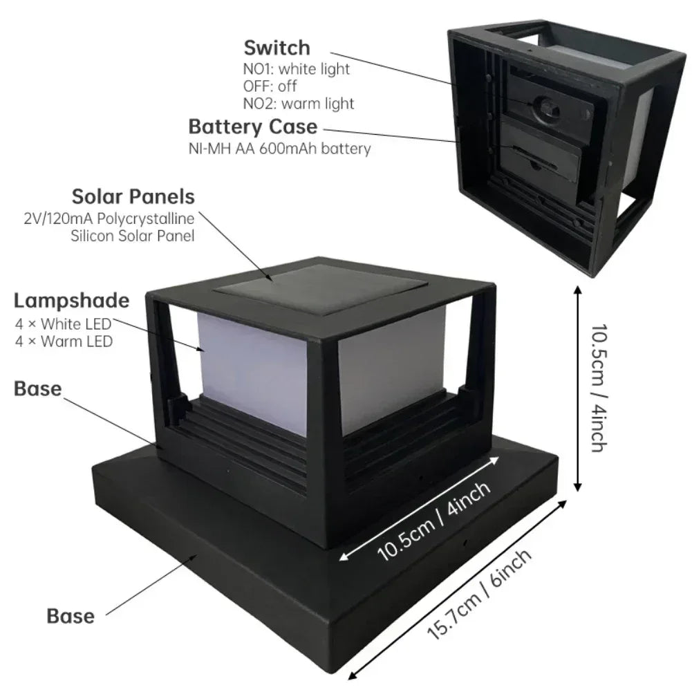 Brighten up your outdoor spaces with the Solar Pillar Light, perfect for garden wooden posts, fences, and lawn decorations. Featuring a combination of white and warm LED lights, this waterproof post lamp provides up to 10 hours of illumination. The solar panel charges the battery during the day, ensuring eco-friendly, energy-efficient lighting all night long. Ideal for gardens, patios, and summer camping decor, these post caps add a stylish and practical touch to your outdoor areas.