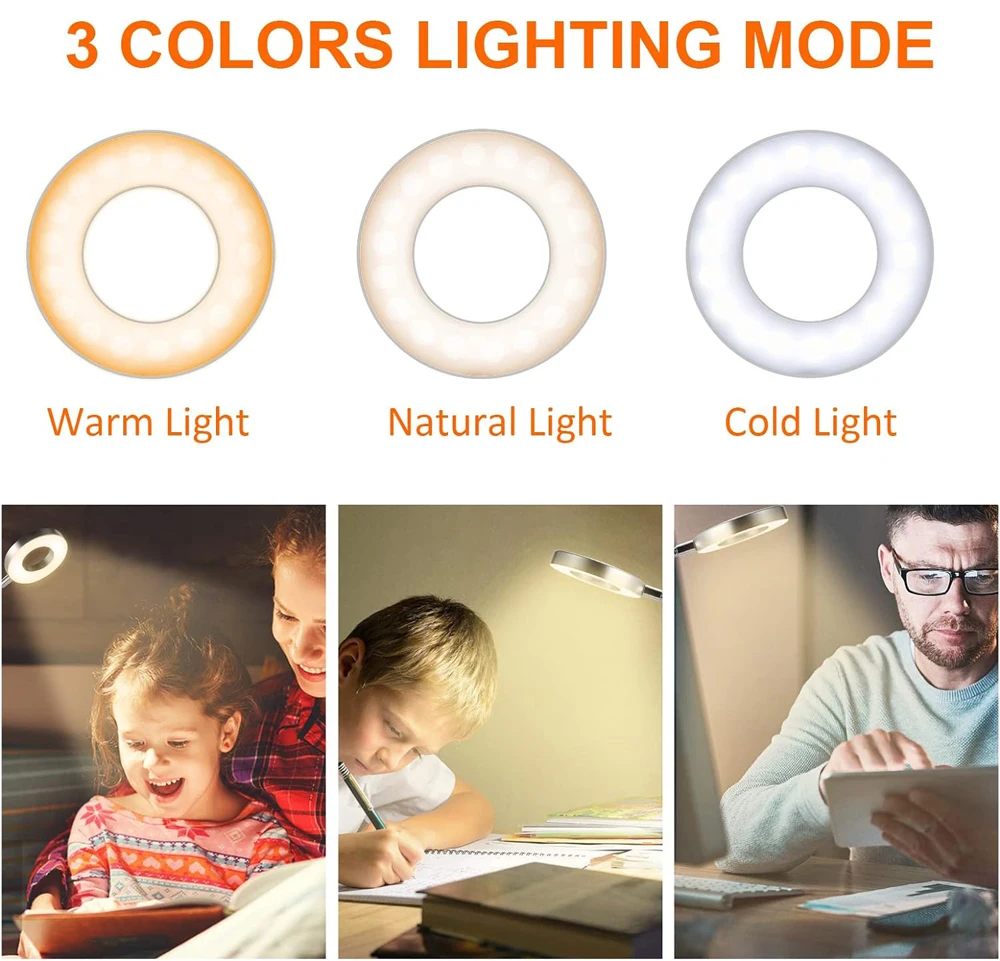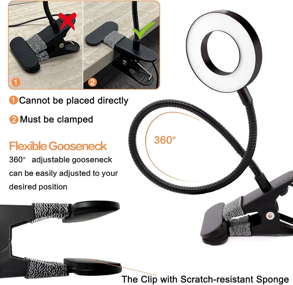 【USB POWERED & FLEXIBLE GOOSENECK】: 360° adjustable gooseneck & ring light design, easily to direct the light wherever you want for best viewing. The clamp lamp comes with a 3.6ft convenient USB charging cord, able to plug into any available USB port, no more worry about the distance between the clip lamp and socket. You can clip lamp to a desk, the headboard, etc.