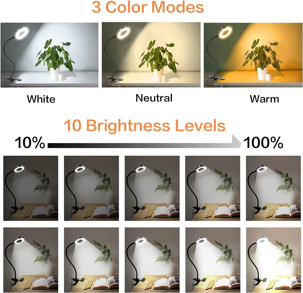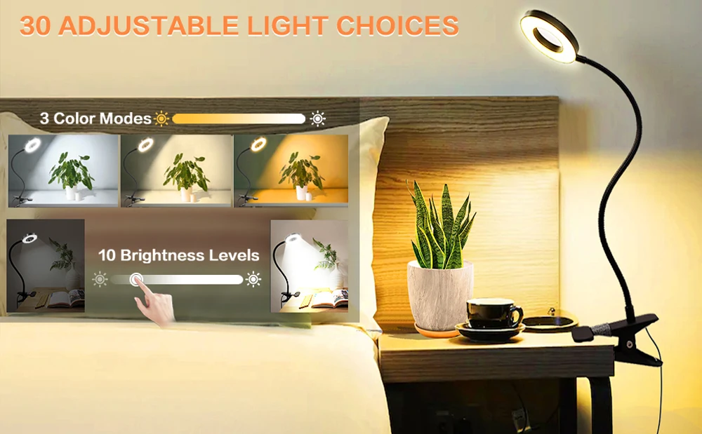 【3 COLOR MODES 10 BRIGHTNESS LEVELS】: reading lights featured with 3 color temperature: amber / warm light (3000K), warm–white light (4500K) and white light (6500K). Each lighting mode has 10 brightness dimming levels, available for your different needs. Clip on bedside or headboard and reading in bed, comfortable light brings you comfortable life!