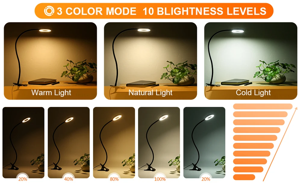 - USB Clamp Design: Conveniently clips onto desks, books, or nightstands.