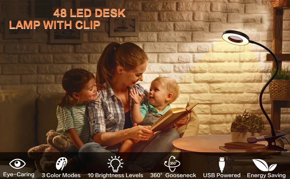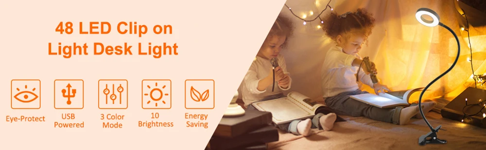 48 LEDs Clip-On Desk Lamp - 360° Flexible, Eye-Caring USB Reading Light for Study
