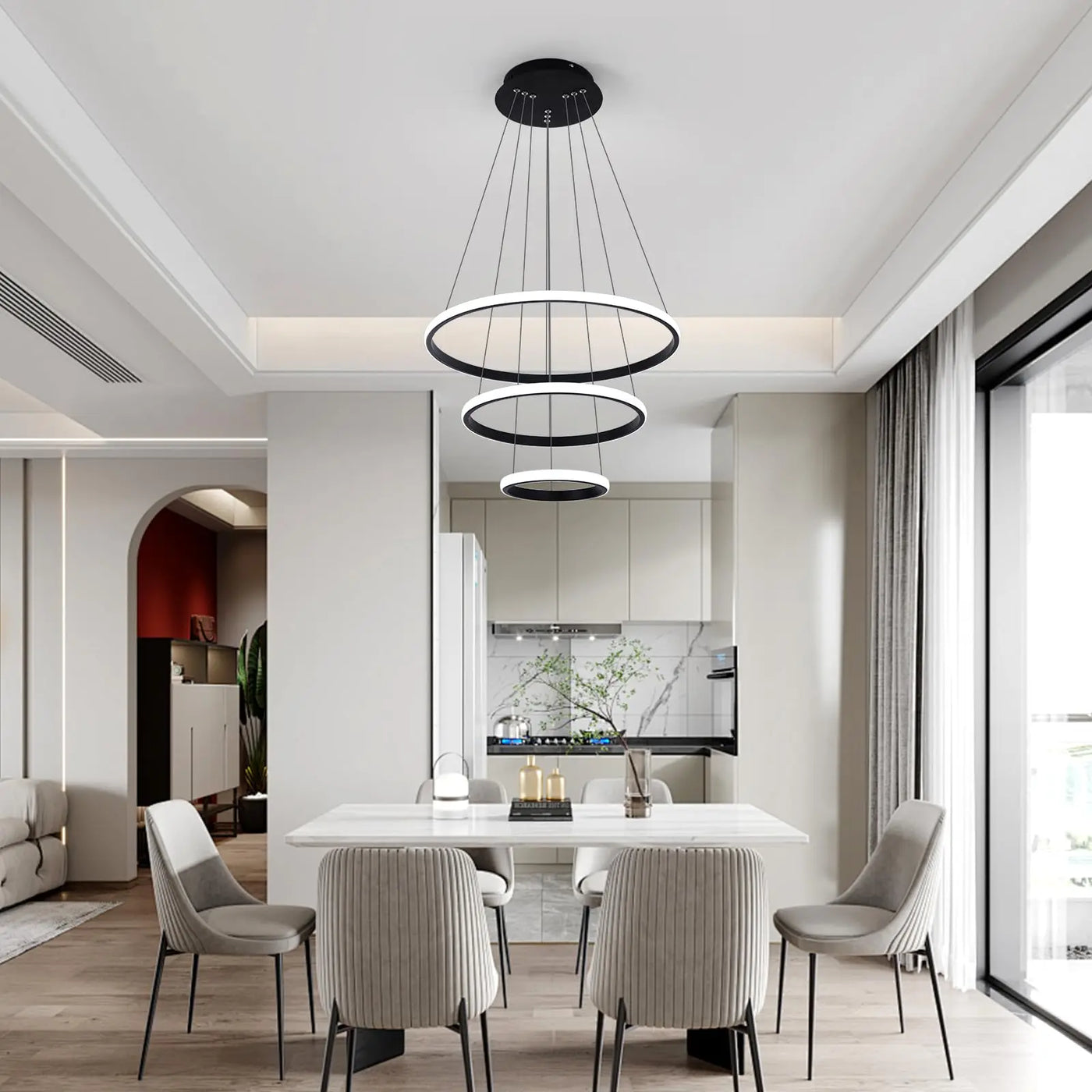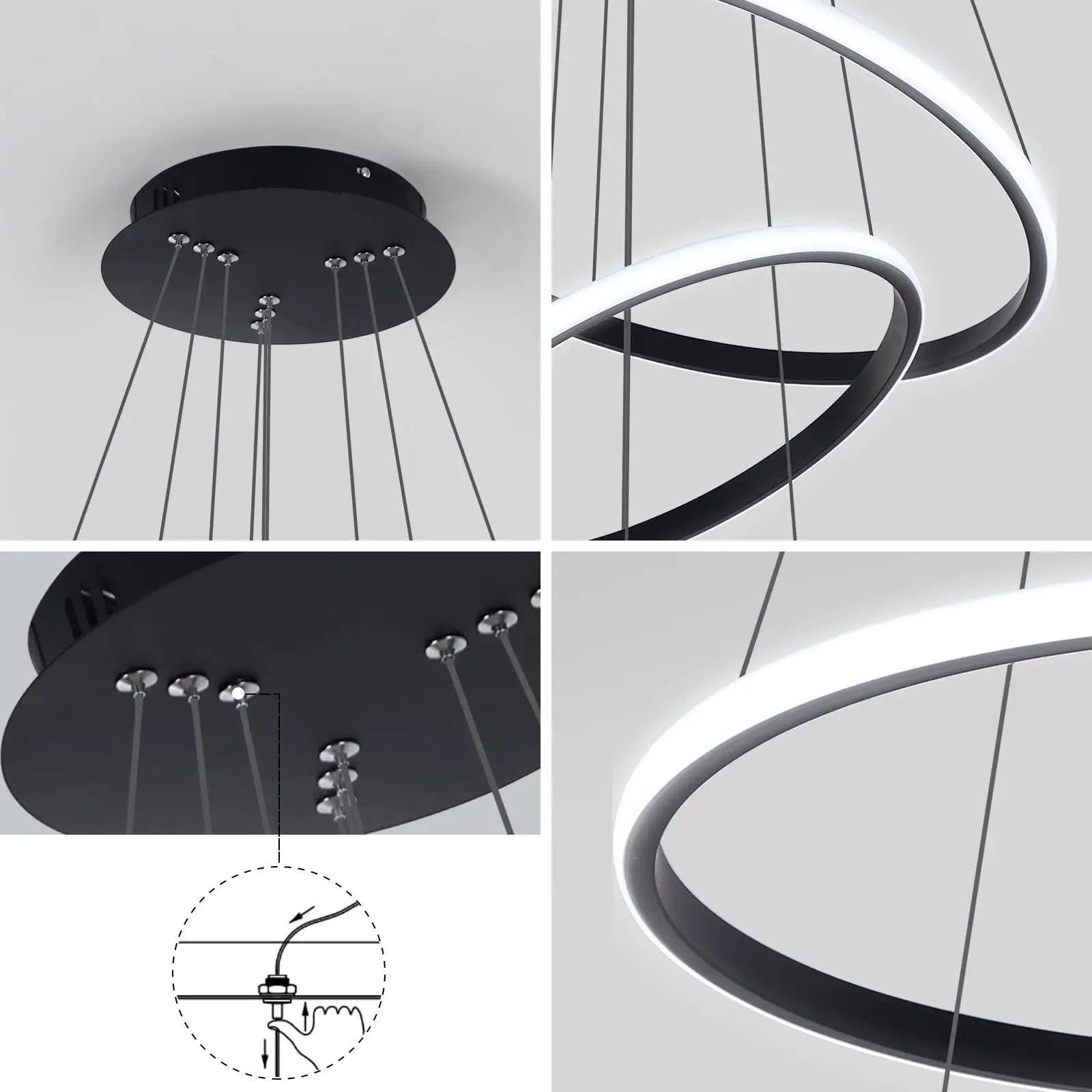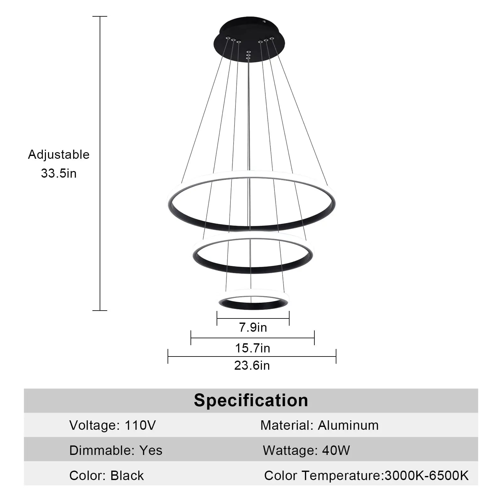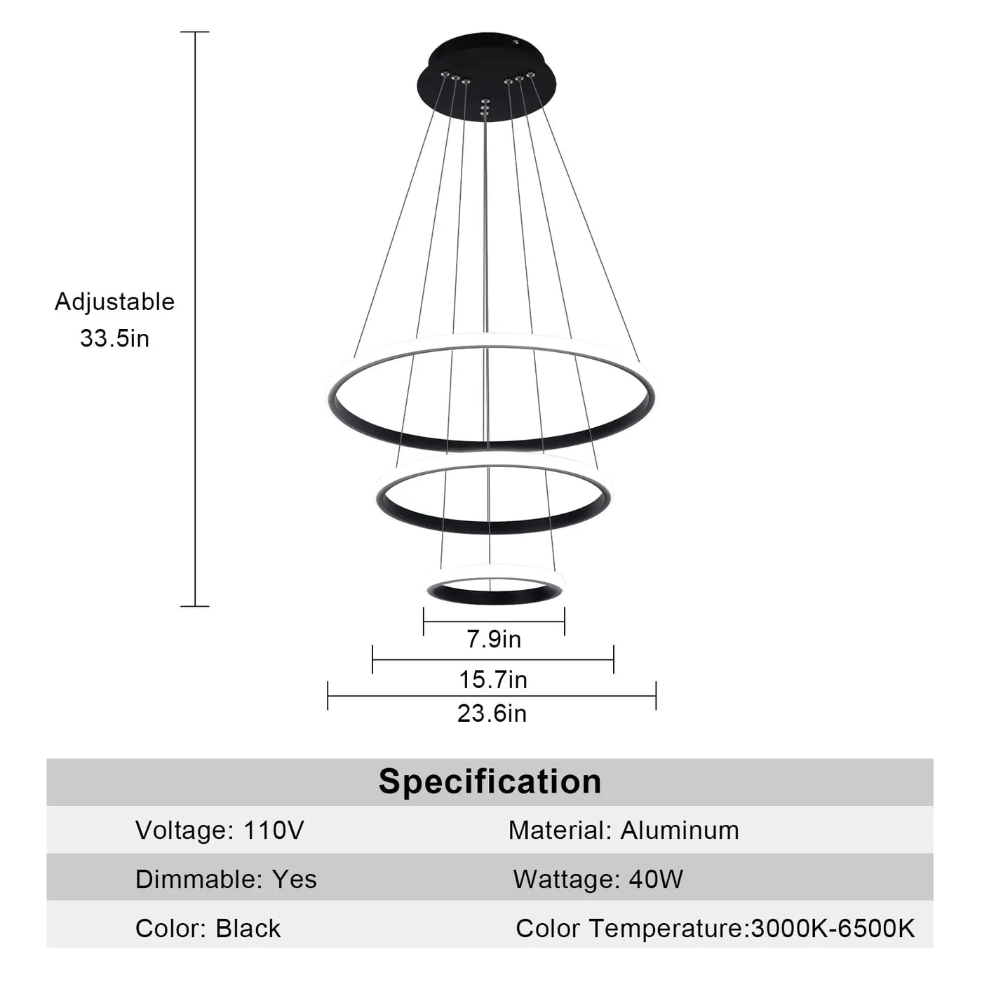 Modern Circular LED Chandelier: The 3-rings LED chandelier is made of premium aluminum, metal, and acrylic.ring diameter: 23.6"+15.7"+7.8", heigh: max 33.5 inch adjustable Ceiling Hanging Light and strip to get different shape.