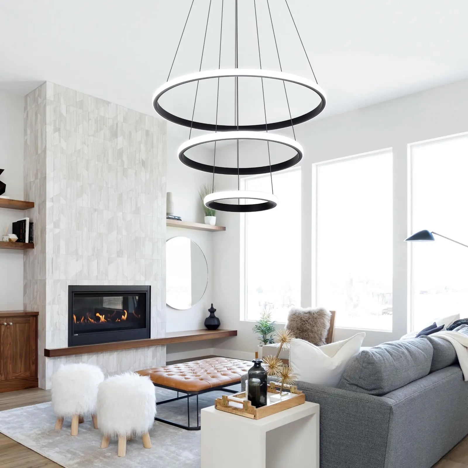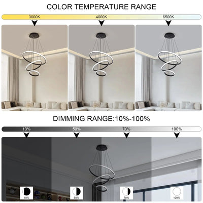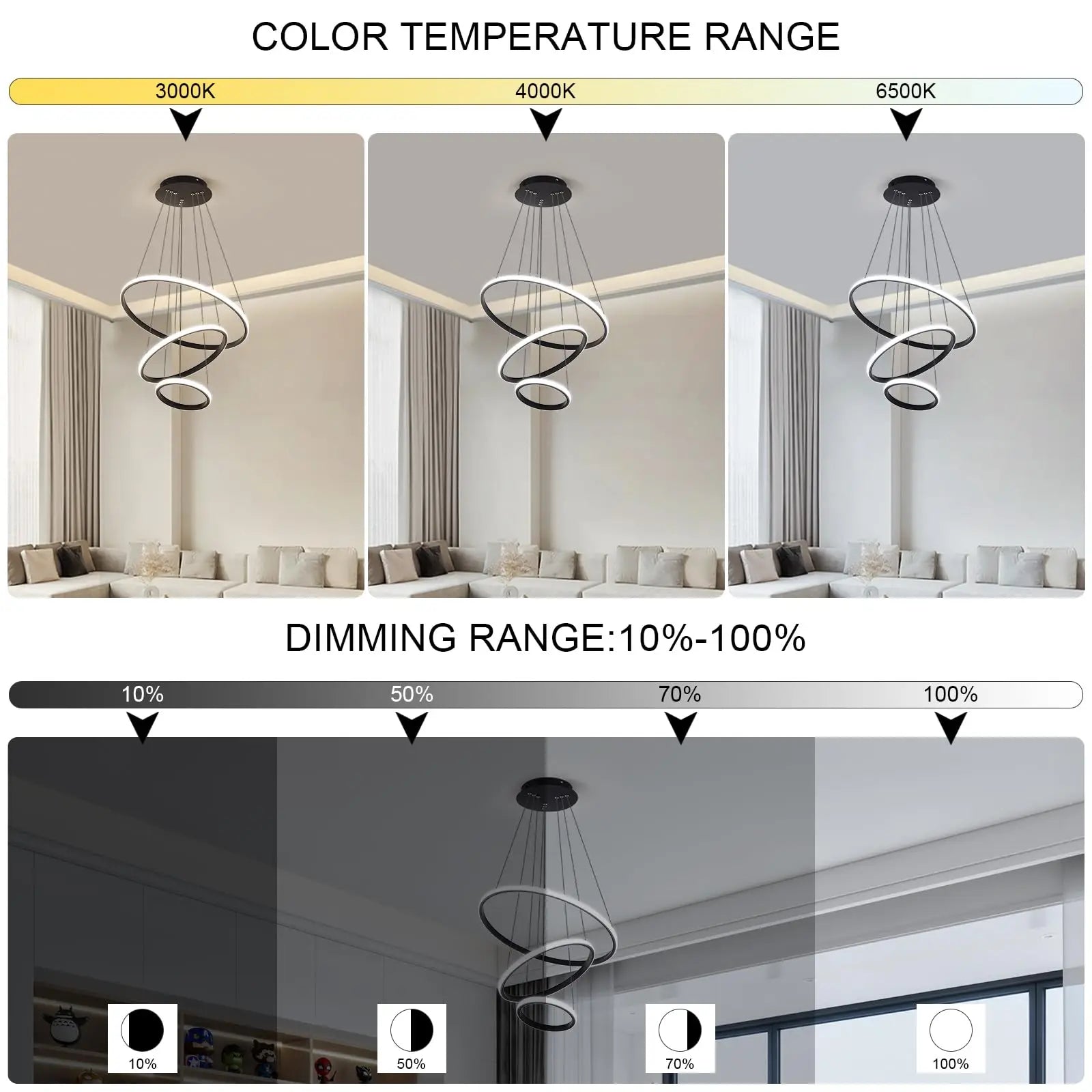 Elevate your home with this stunning 3-rings LED chandelier. Featuring a sleek and modern design, this pendant light is made from premium aluminum, metal, and acrylic materials. It offers adjustable lighting, ranging from warm 3000K to cool 6500K, allowing you to create the perfect ambiance for any room. The chandelier is dimmable via remote control, offering 1581 lumens of bright illumination with a CRI of 80+ for vibrant lighting that enhances your space. Ideal for dining rooms, living rooms, or entryways, this chandelier serves as a luxurious and modern centerpiece.