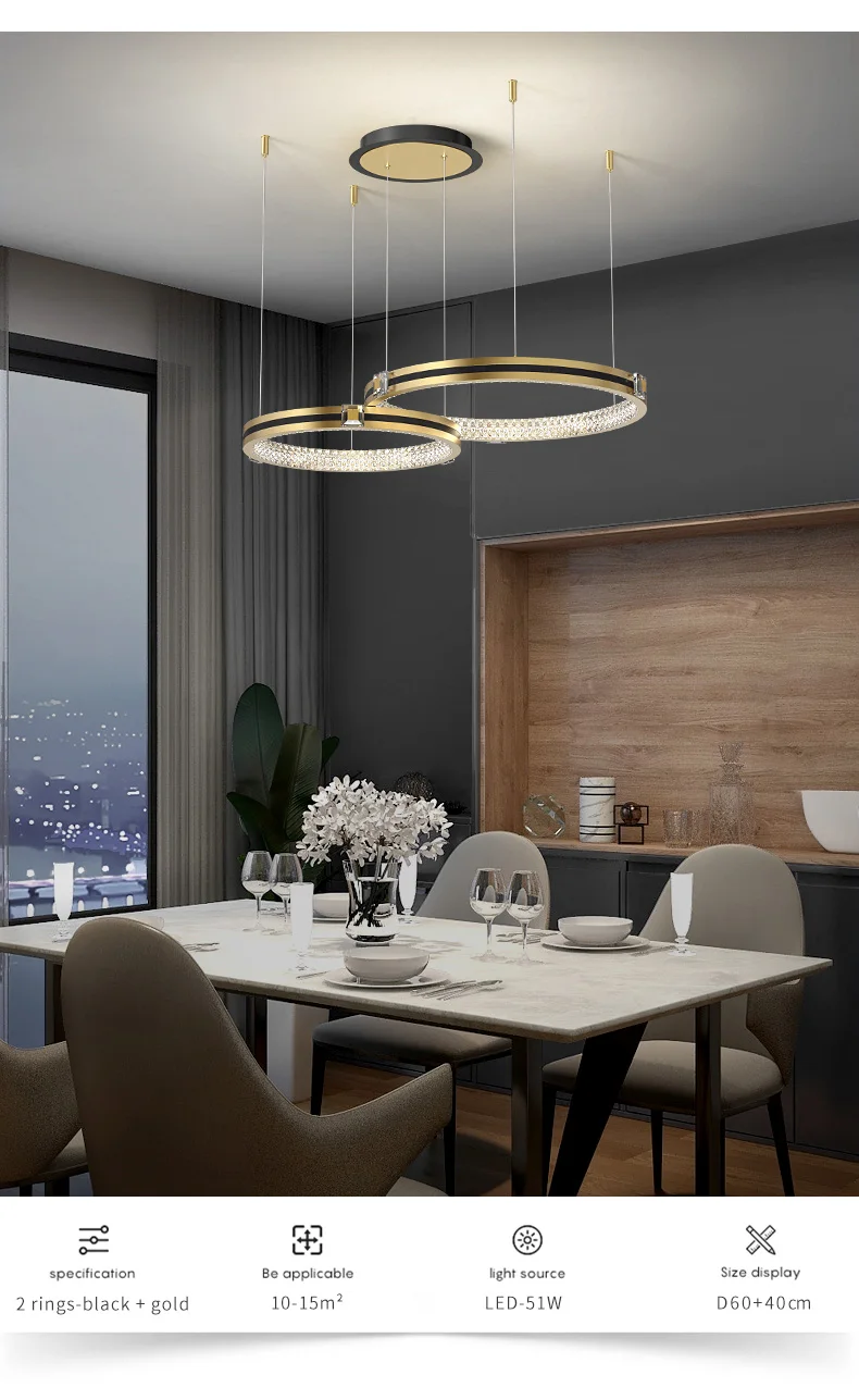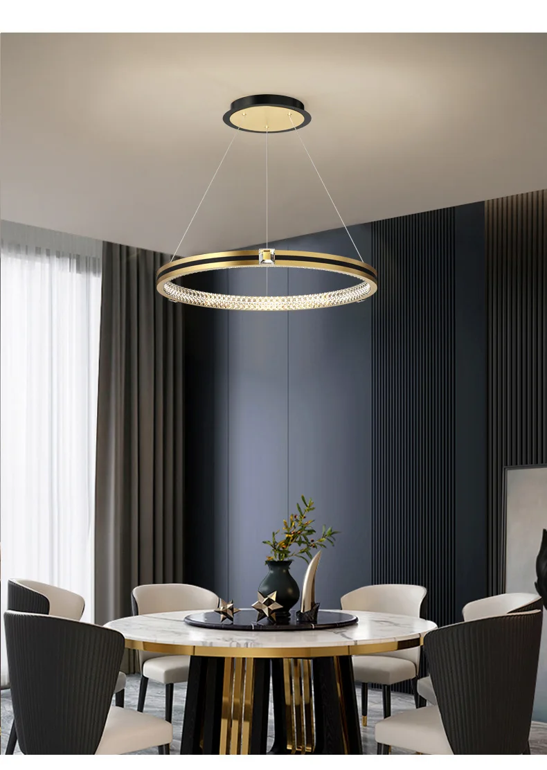 Indulge in the luxurious ambiance of this modern crystal chandelier, perfect for creating a statement in your dining room, grand living room, hall, villa, or restaurant! This stunning light fixture features a captivating ring design with sparkling crystals, adding a touch of elegance and sophistication to your space.