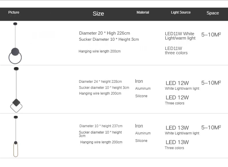 Available in black or white finishes and multiple size options, this pendant lamp supports warm light, white light, and 3-color dimming modes depending on the selected model. With cord pendant installation and wide voltage compatibility (90–260V), it provides reliable lighting performance for modern interiors.