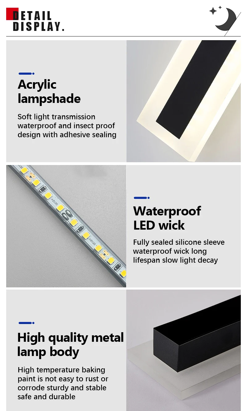 Equipped with more than 20 integrated LED light sources, it delivers bright and uniform illumination across 10–15 square meters. The design creates a stylish architectural lighting effect on walls, enhancing entrances, balconies, and garden areas. Operating on a wide AC 85–265V voltage range, it offers stable and energy-efficient performance for daily lighting use.