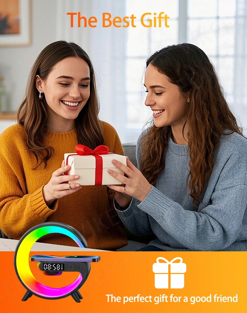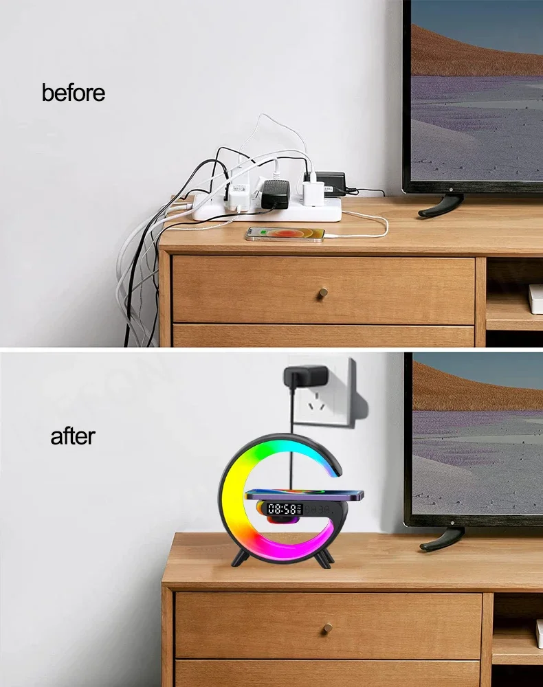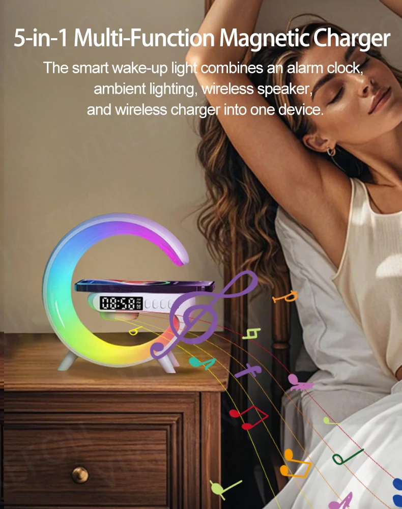 • Features: Wireless charging, Bluetooth speaker, LED lamp, Alarm clock, Rechargeable battery, Night light, Bedside lamp