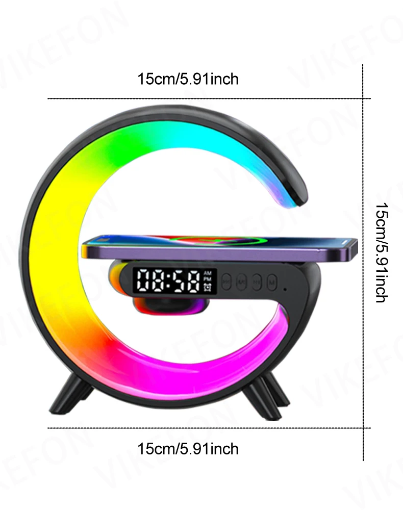 Function description: 15W Fast wireless charging, atmosphere lamp, bedside lamp, dazzling light effect, Bluetooth audio, speaker play and Aux , TF ,Time, Alarm Clock mode.